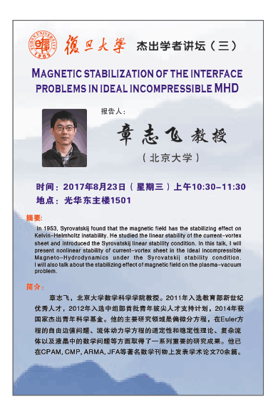 简介:章志飞,北京大学数学科学学院教授。2011年入选教育部新世纪优秀人才,2012年入选中组部首批青年拔尖人才支持计划,2014年获国家杰出青年科学基金。他的主要研究领域是偏微分方程,在Euler方程的自由边值问题、流体动力学方程的适定性和稳定性理论、复杂流体以及液晶中的数学问题等方面取得了一系列重要的研究成果。他已在CPAM, CMP, ARMA, JFA等著名数学刊物上发表学术论文70余篇。