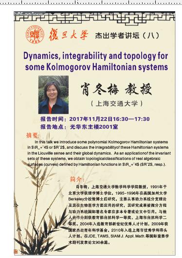 简历: 肖冬梅,上海交通大学数学科学学院教授,1991年于北京大学获理学博士学位,1995-1996年在美国加州大学Berkeley分校做博士后研究,主要从事动力系统分支理论及其在生物医学方面应用的研究,其研究成果被微分方程与动力系统国际著名专家在多本专著或论文中引用,与他人合作分别获教育部自然科学一等奖,上海市自然科学二等奖。2004年入选教育部新世纪优秀人才计划,2009年获国家杰出青年科学基金,2010年入选上海市优秀学科带头人计划。在JDE, TAMS, SIAM J. Appl. Math.等国际重要学术期刊发表论文90余篇。