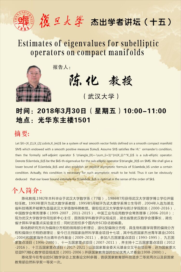 个人简介: 陈化教授,1982年本科毕业于武汉大学数学系(77级),1986年7月获得武汉大学理学博士学位并留校任教。1993年晋升为武大数学系教授,1995年5月被评为武大数学系博士生导师,2004年入选为湖北省科技精英并被聘为首届武汉大学珞珈特聘教授。曾担任武汉大学数学与统计学院院长(2000-2016),中国数学会常务理事(1999-2007,2011-2015),中国工业与应用数学会常务理事(2006-2010);现为武汉大学数学协同创新中心主任,国务院学科数学评议组成员,湖北省暨武汉数学会理事长,湖北省计算科学省重点实验室主任;同时还担任多个国内外SCI杂志的编委。