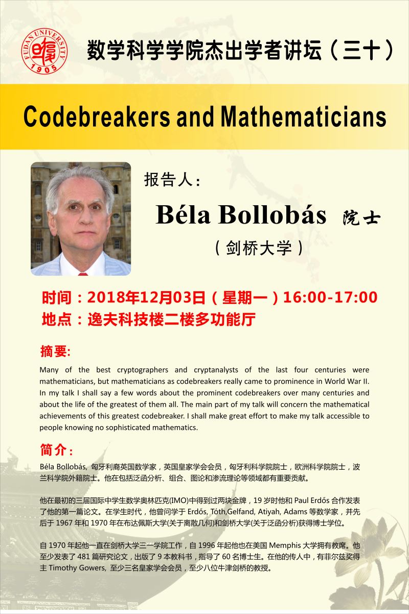 嘉宾简介:Béla Bollobás, 匈牙利裔英国数学家,英国皇家学会会员,匈牙利科学院院士,欧洲科学院院士,波兰科学院外籍院士。他在包括泛函分析、组合、图论和渗流理论等领域都有重要贡献。