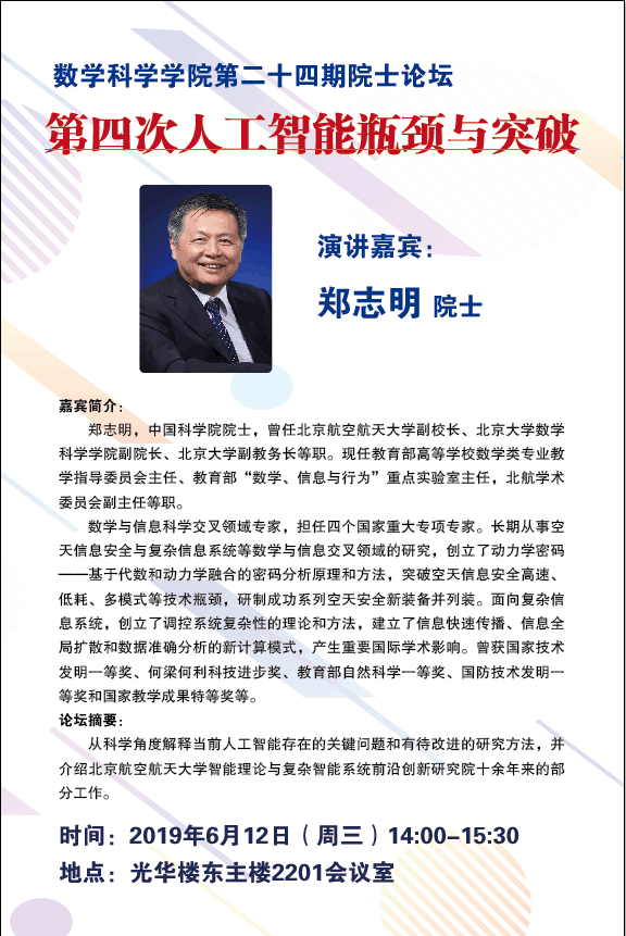 简介:郑志明,中国科学院院士,曾任北京航空航天大学副校长、北京大学数学科学学院副院长、北京大学副教务长等职。现任教育部高等学校数学类专业教学指导委员会主任、教育部“数学、信息与行为”重点实验室主任,北航学术委员会副主任等职。