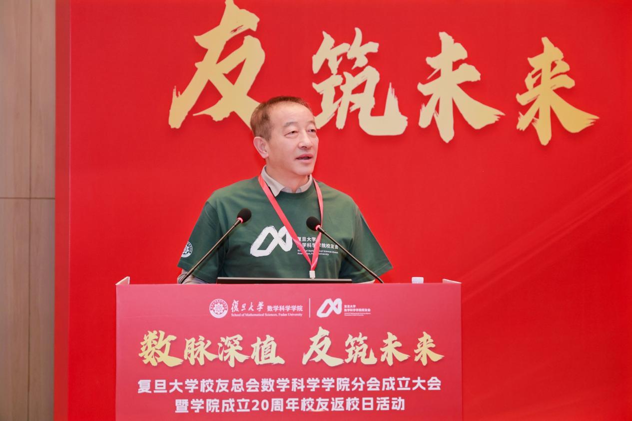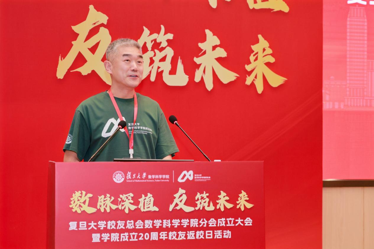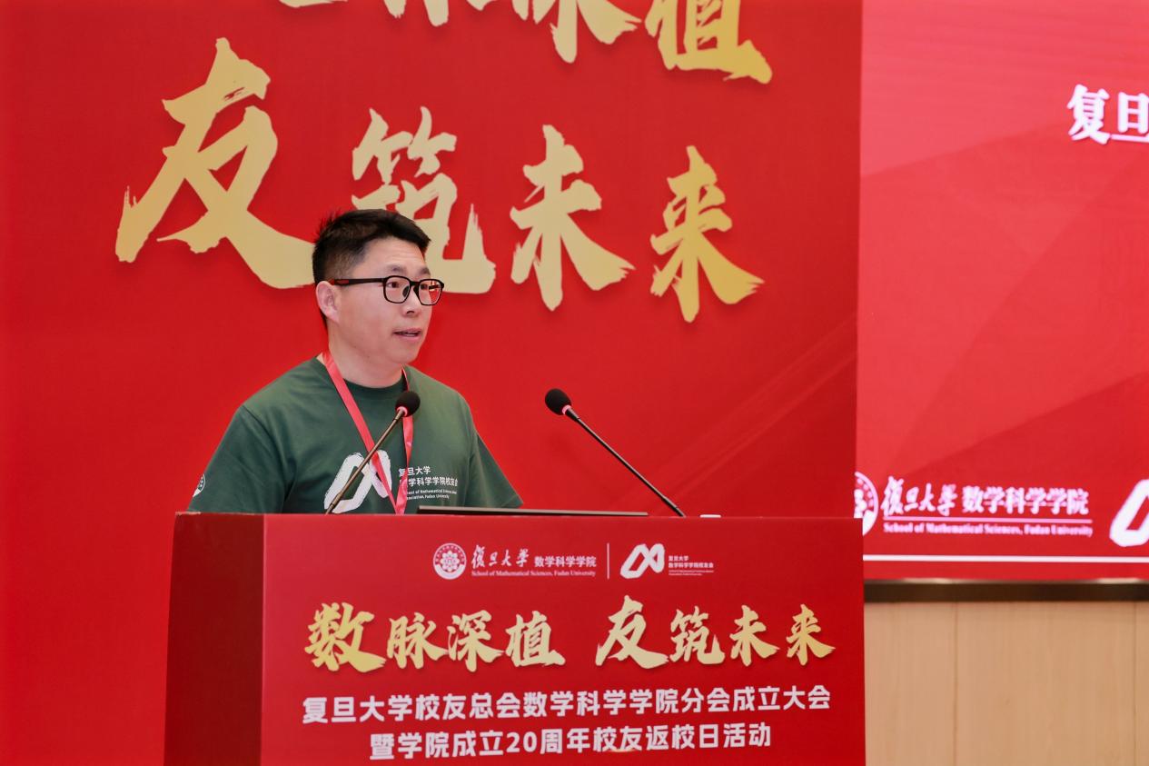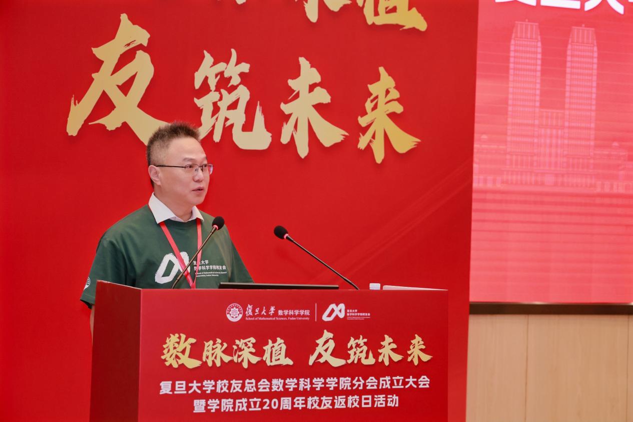 数学科学学院副院长刘建峰介绍了校友会筹备工作。他表示,筹备组精心织密校友网络,全面梳理校友信息,构建起超万人的动态数据库,夯实校友情感根基;健全组织运行机制,严格对标学校相关文件要求,全方位完善校友分会运行机制,有效凝聚发展共识;凝练标识设计,深度融合数学学科特色与校友文化底蕴,精心打造复旦数学校友会专属标识,构筑起校友精神图腾。他期待未来与校友携手同行,共同书写“复旦数学人”的崭新篇章。