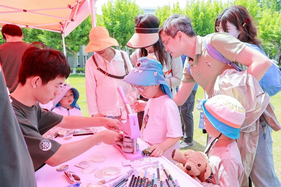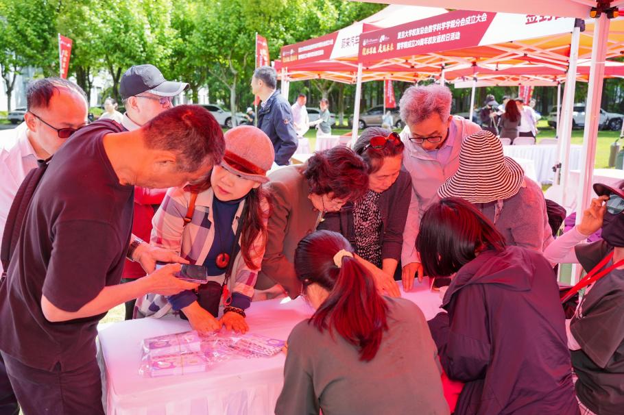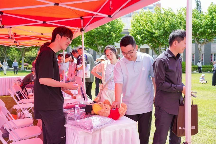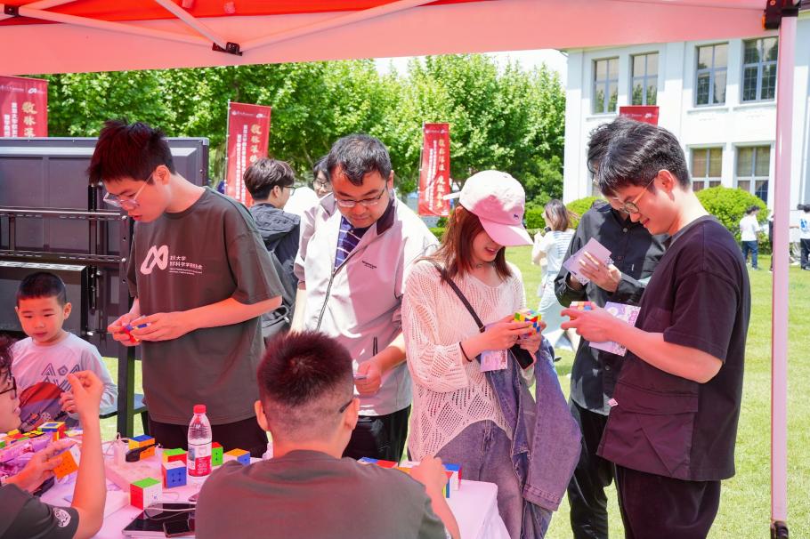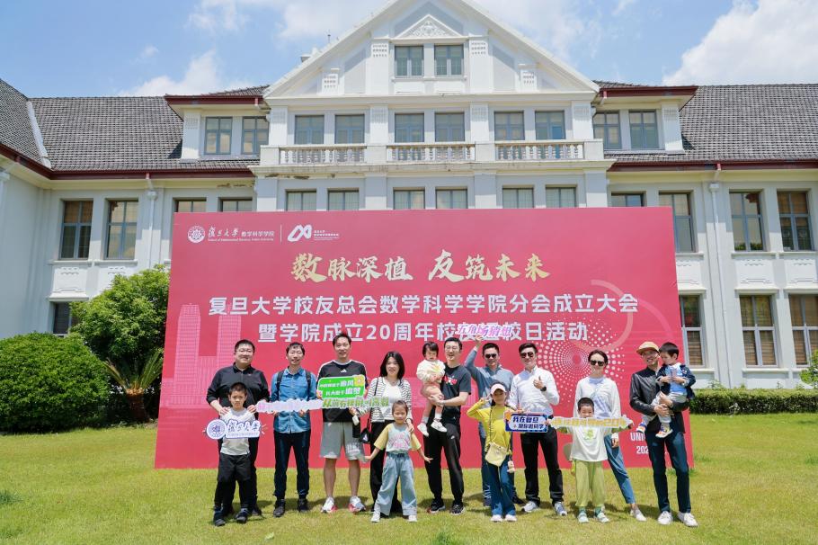 为欢迎校友回到母校,数学科学学院还举行了校友返校日活动。十余个学生社团在子彬院的草坪呈现了数学游园会,校友们可以打卡集章兑换限定纪念品。学院还特地设立了“复二代”趣味数学游戏区,启蒙思维,播种复旦情怀。在定制 20 周年合影墙前,校友们定格重逢笑颜。
