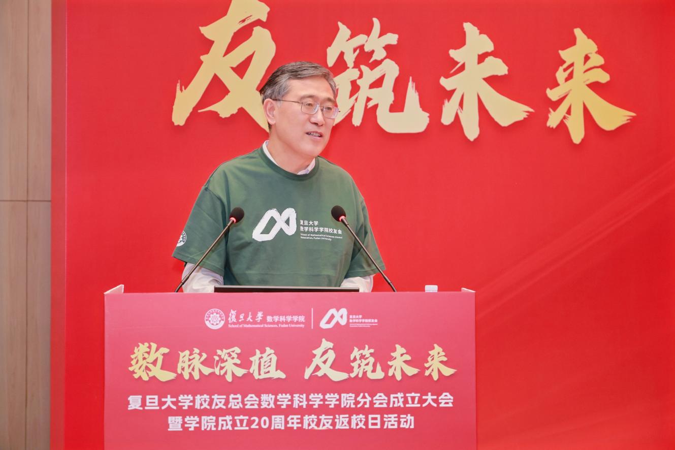 周磊副校长在讲话中向数学科学学院校友分会的成立致以热烈祝贺,并向在场的校友们致以诚挚的问候。他表示,数脉深植,承载着复旦数学人的坚守与求索;友筑未来,展现了我们共同期许的复旦数学星空。他强调,数学科学学院校友分会当立磐石之基,在第一届理事会的带领下,铸就数学人精神家园;当秉凌云之志,期待见证更多“校友力量”、“校友智慧”,共绘学科蓝图;当怀天下之任,母校始终做校友发展的坚强后盾,全力支撑校友发展。期待在未来共同把握时代机遇,在服务国家战略的远大征程上携手奋进。