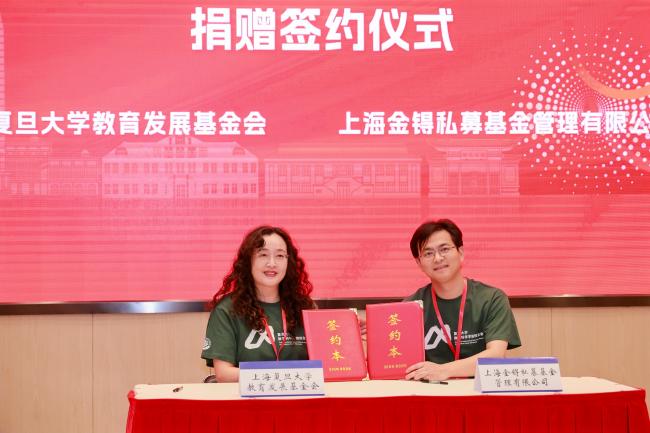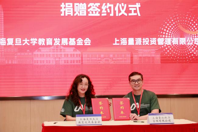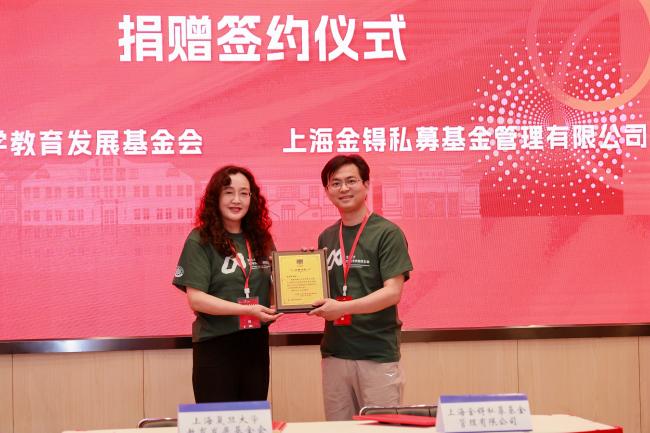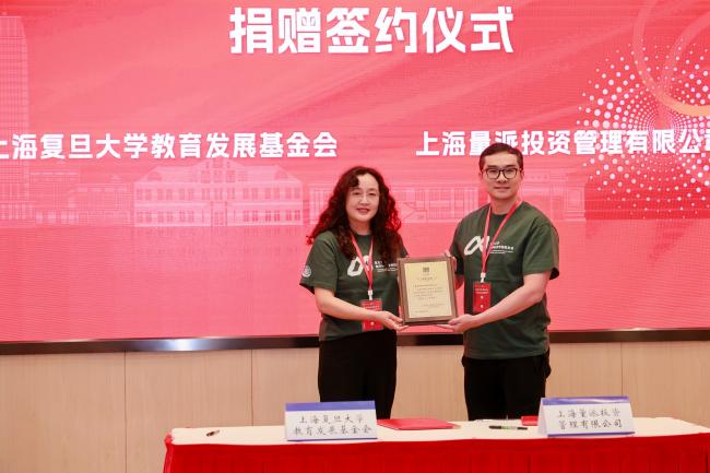 上海金锝私募基金管理有限公司投资总监王立峰副会长、上海量派投资管理有限公司CEO孙林副会长、校数学系9718班本科生代表樊义副会长分别与刘莉处长签署捐赠协议。刘莉处长代表上海复旦大学教育发展基金会为他们分别颁发捐赠牌。