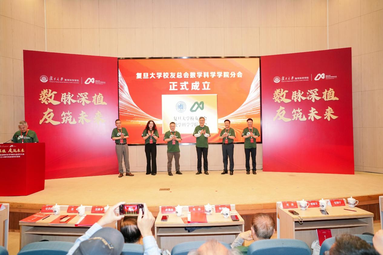 在热烈的气氛中,周磊副校长,沈维孝会长,刘莉处长,沈峰、谭塘芳、史浩樑副会长共同为复旦大学校友总会数学科学学院分会揭牌。