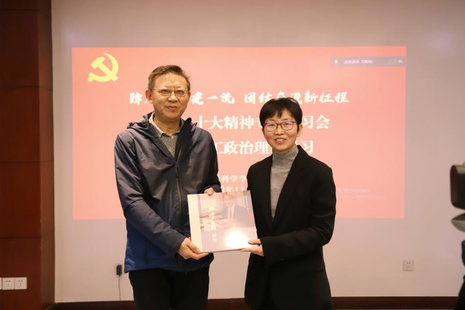 值此苏步青先生诞辰120周年之际,为弘扬苏步青先生将“毕生精力无私地奉献给了人民的教育事业”的崇高师德,传承苏老“此生到老属于党”的爱党爱国的赤子深情,数学科学学院党委副书记、院长陈猛教授向迟楠教授赠送《苏步青画传》。画传图文并茂展示了苏步青先生为科学强国、教育强国倾情奋斗的百年历程。