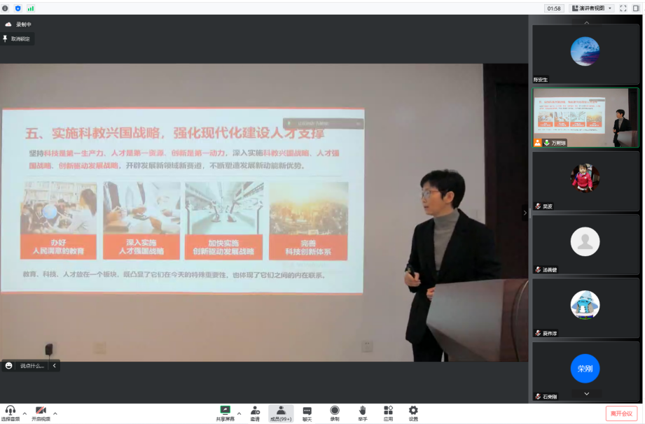 迟楠教授,作为信息学院老师,与我们学科相近。她作的二十大精神专题星空(中国),系统介绍了参加二十大的经过、感受以及体会,非常接地气,很有启发性。让人印象深刻的是迟楠老师提出的让她震撼的三件事情:第一个是她第一次参观了人民大会堂;第二个是二十大的星空(中国)会历时110分钟,响起32次掌声;对她而言影响最深刻的震撼,在同其他上海代表的交流产生了的震撼,也深深影响了我们。她还介绍了部分上海市一线基层党代表,留给我们深刻的印象。作为高校教师,教育工作者,要倡导青年学生积极投身青春的奋斗中,融入党和人民的事业中,引导学生怀着满腔的热情投身于基层的服务基层的教育实践当中。而我们自己,通过学习党的二十大的文件精神,沿着前辈们走上的路去创造第一个复旦。