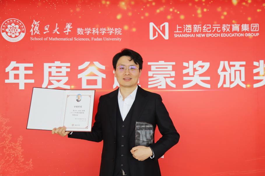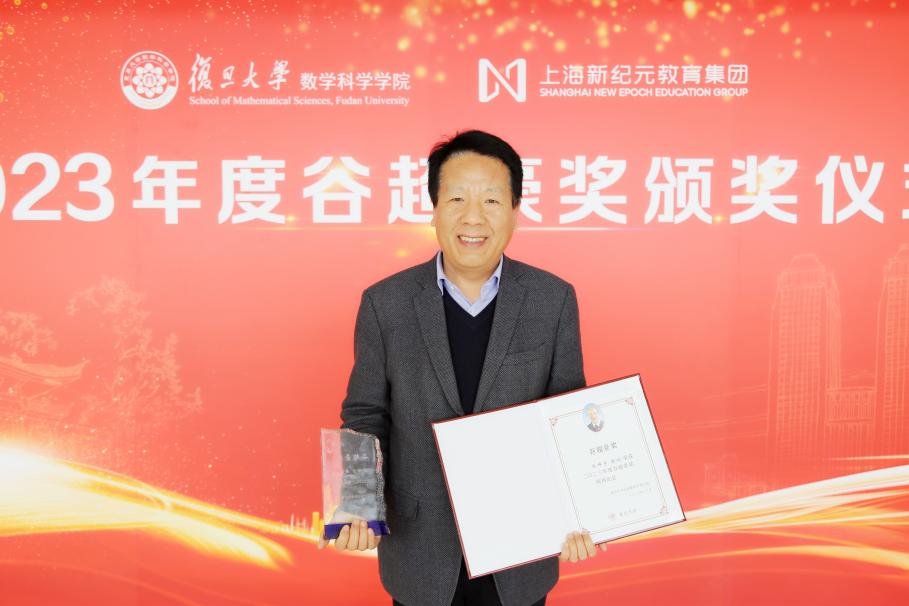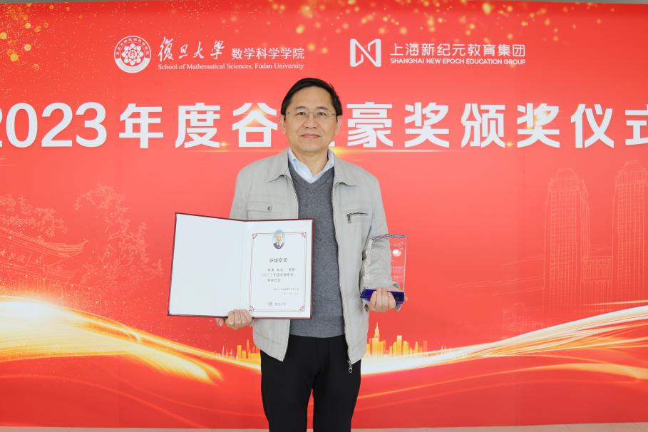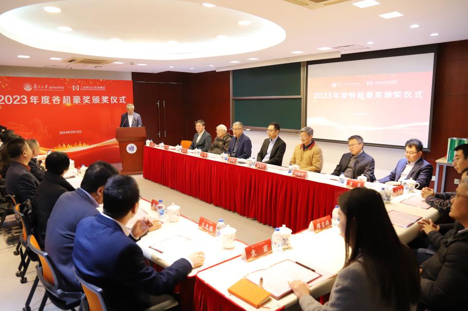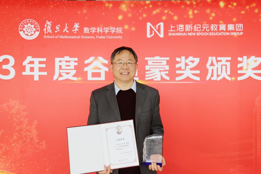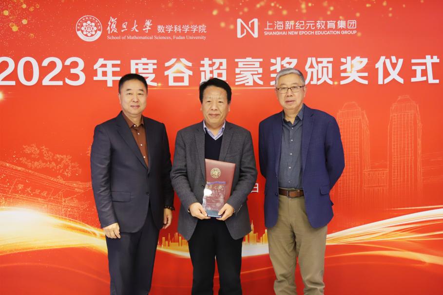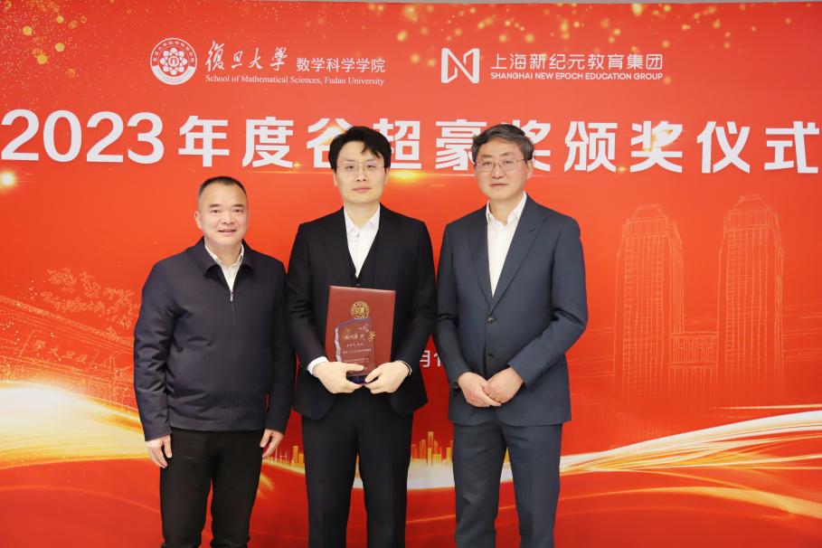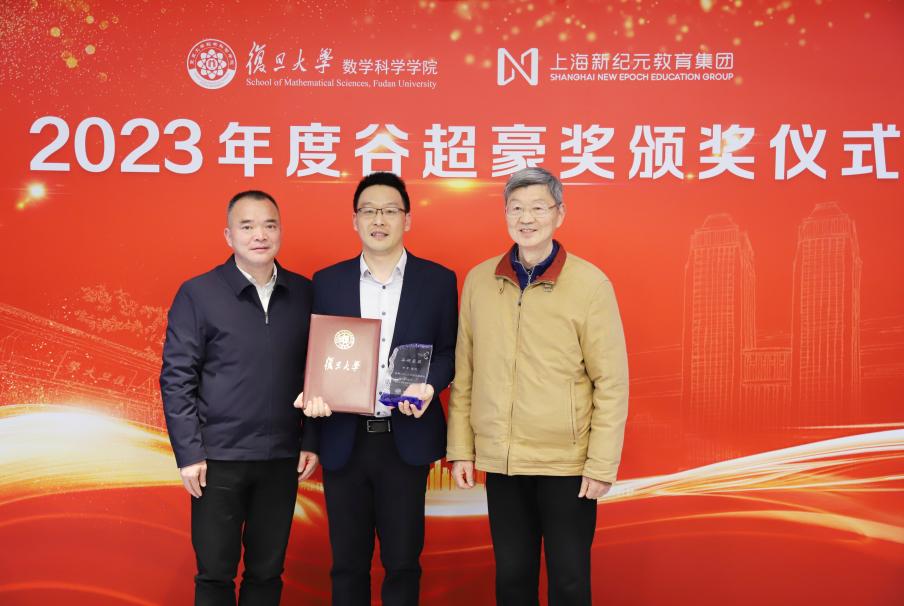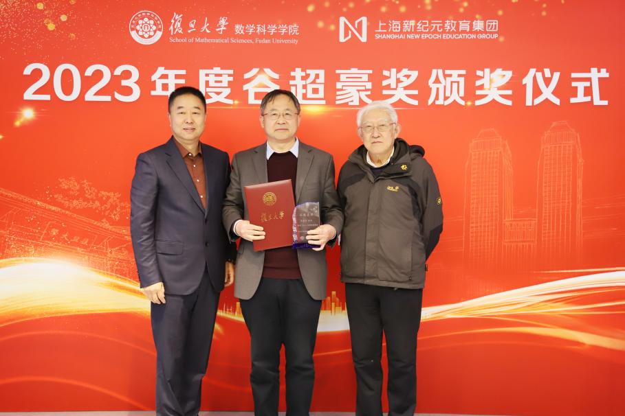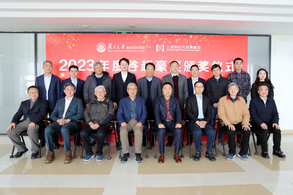 3月12日下午, 2023年度“谷超豪奖”颁奖仪式在光华楼东主楼2201会议室举行。上海新纪元教育集团董事长陈伟志、总裁办主任陈豆豆、上海新纪元公益基金会专员袁茵,北京国际数学研究中心主任、国家基金委数学天元基金学术领导小组组长、北京大学田刚院士,温州市人民政府驻上海联络处主任徐清雨、协作处副处长林捷,复旦大学副校长姜育刚,数学科学学院洪家兴院士、陈恕行院士,上海数学中心主任李骏院士,上海数学中心副主任、数学科学学院副院长沈维孝院士,数学科学学院院长雷震,以及往届“谷超豪奖”获奖者代表等参加了颁奖仪式。数学科学学院党委书记王光临主持颁奖仪式。