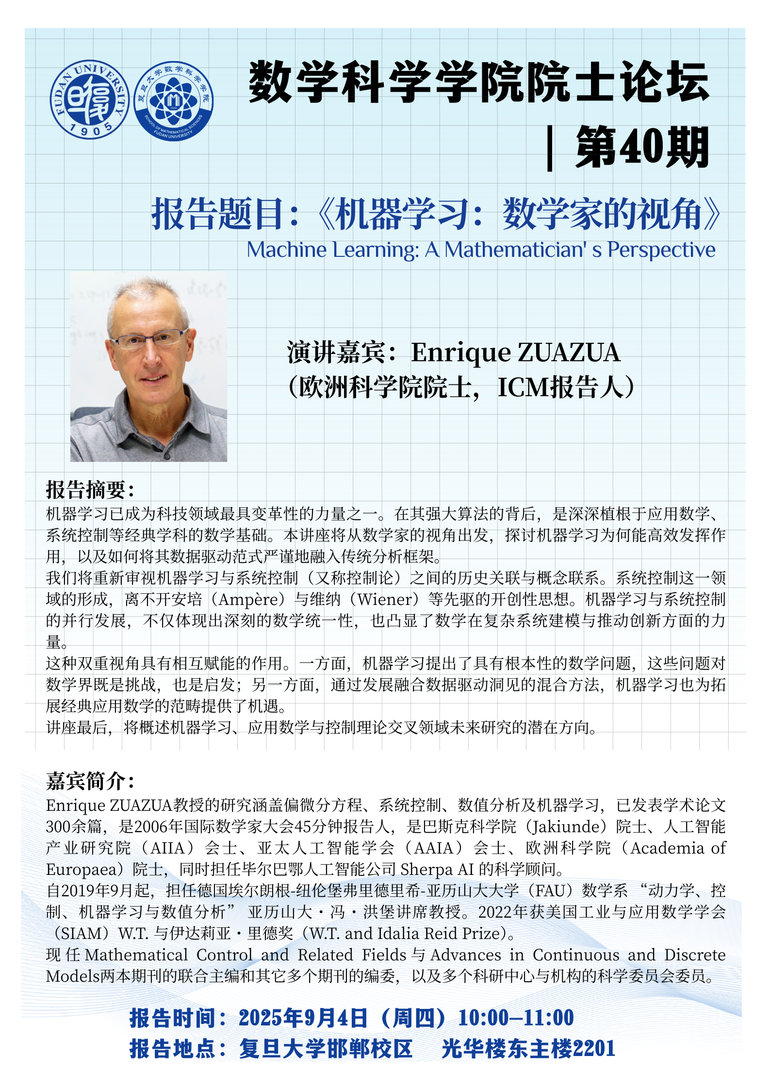 机器学习已成为科技领域最具变革性的力量之一。在其强大算法的背后,是深深植根于应用数学、系统控制等经典学科的数学基础。本讲座将从数学家的视角出发,探讨机器学习为何能高效发挥作用、以及如何将其数据驱动范式严谨地融入传统分析框架。我们将重新审视机器学习与系统控制(又称控制论)之间的历史关联与概念联系。系统控制这一领域的形成,离不开安培(Ampère)与维纳(Wiener)等先驱的开创性思想。机器学习与系统控制的并行发展,不仅体现出深刻的数学统一性,也凸显了数学在复杂系统建模与推动创新方面的力量。