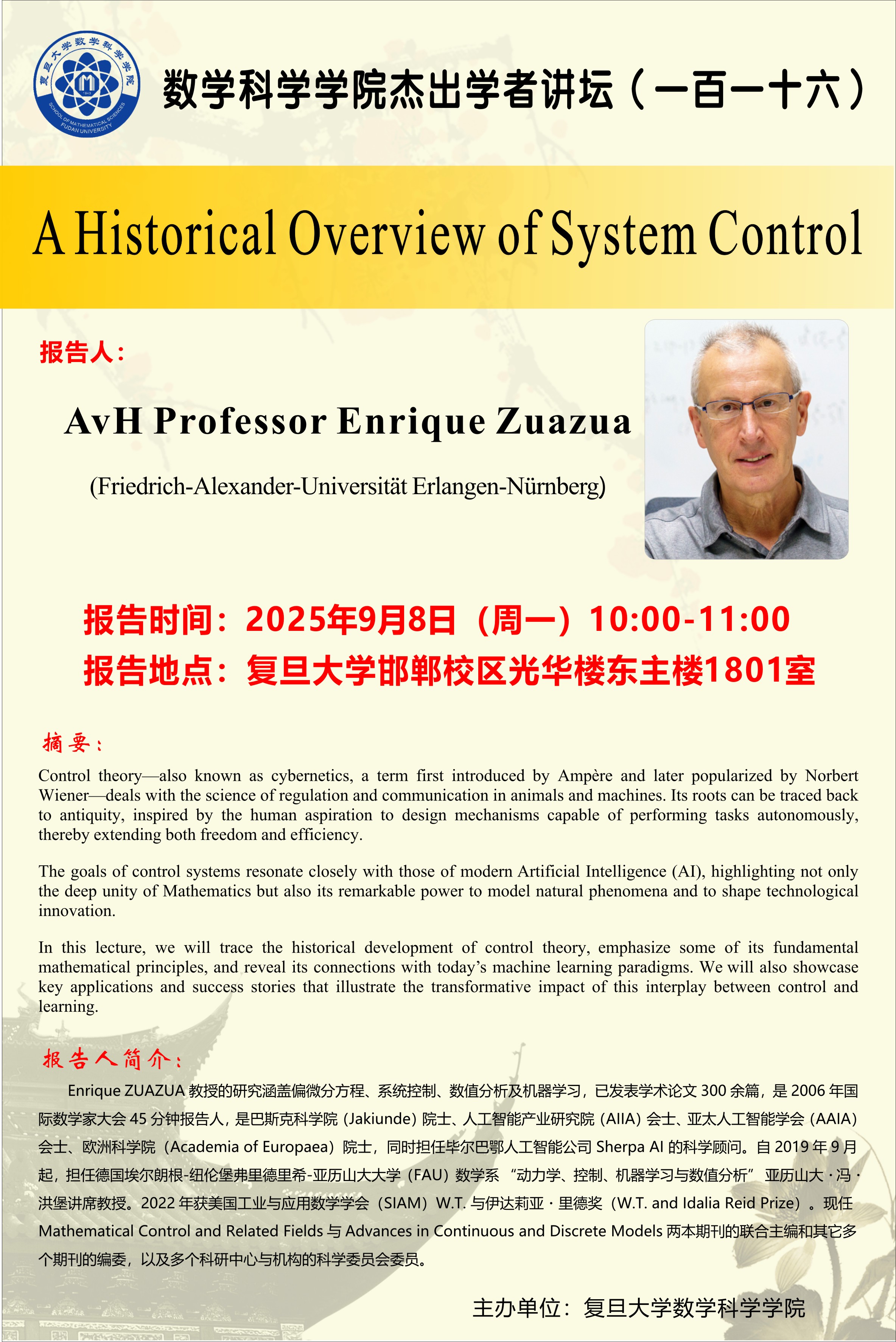 In this lecture, we will trace the historical development of control theory, emphasize some of its fundamental mathematical principles, and reveal its connections with today’s machine learning paradigms. We will also showcase key applications and success stories that illustrate the transformative impact of this interplay between control and learning.