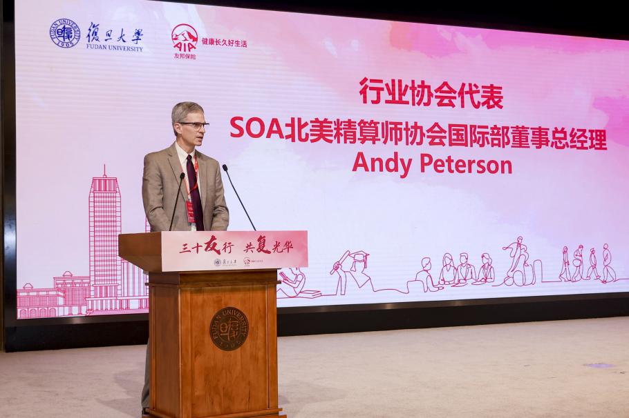 北美精算师协会国际董事总经理Andy Peterson先生转达协会首席执行官Gregory先生的贺辞,对友邦-复旦精算中心三十年来的成绩表示肯定,期待中心继续以其卓越的业绩和对社会责任的承担,书写更加辉煌的篇章。