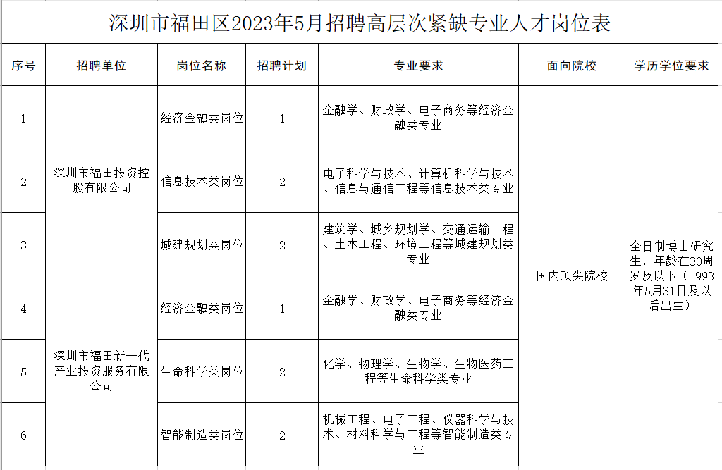 全日制博士研究生(包括应届毕业生),年龄在30周岁及以下(1993年5月31日及以后出生),特别优秀的年龄可以适当放宽。所学专业为经济金融、生命科学、信息技术、生态环保、规划建筑、智能制造、材料研究类等福田区产业发展紧缺的相关专业。