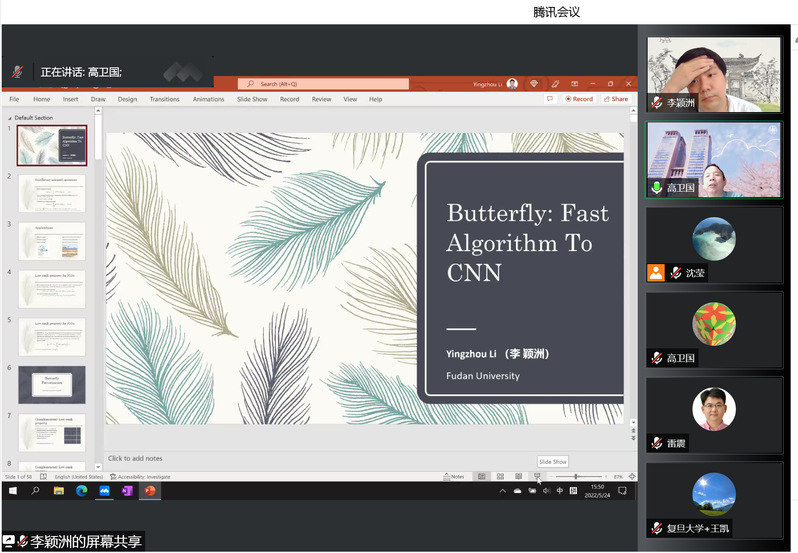 2022年5月24日(星期二)下午,数学科学学院以腾讯会议线上形式召开了2022年校庆星空(中国)会暨2022年非线性数学模型与方法教育部重点实验室学术年会。首先陈猛教授做了题为“高维代数簇的精细分类问题:现状及展望”的精彩星空(中国)。然后,张国华教授、李颖洲青年研究员分别作了题为“New dynamical characterization of countable amenable groups”“From fast algorithm to neural network: Butterfly factorization and Butterfly-Net”的学术星空(中国),介绍了最新的学术进展。