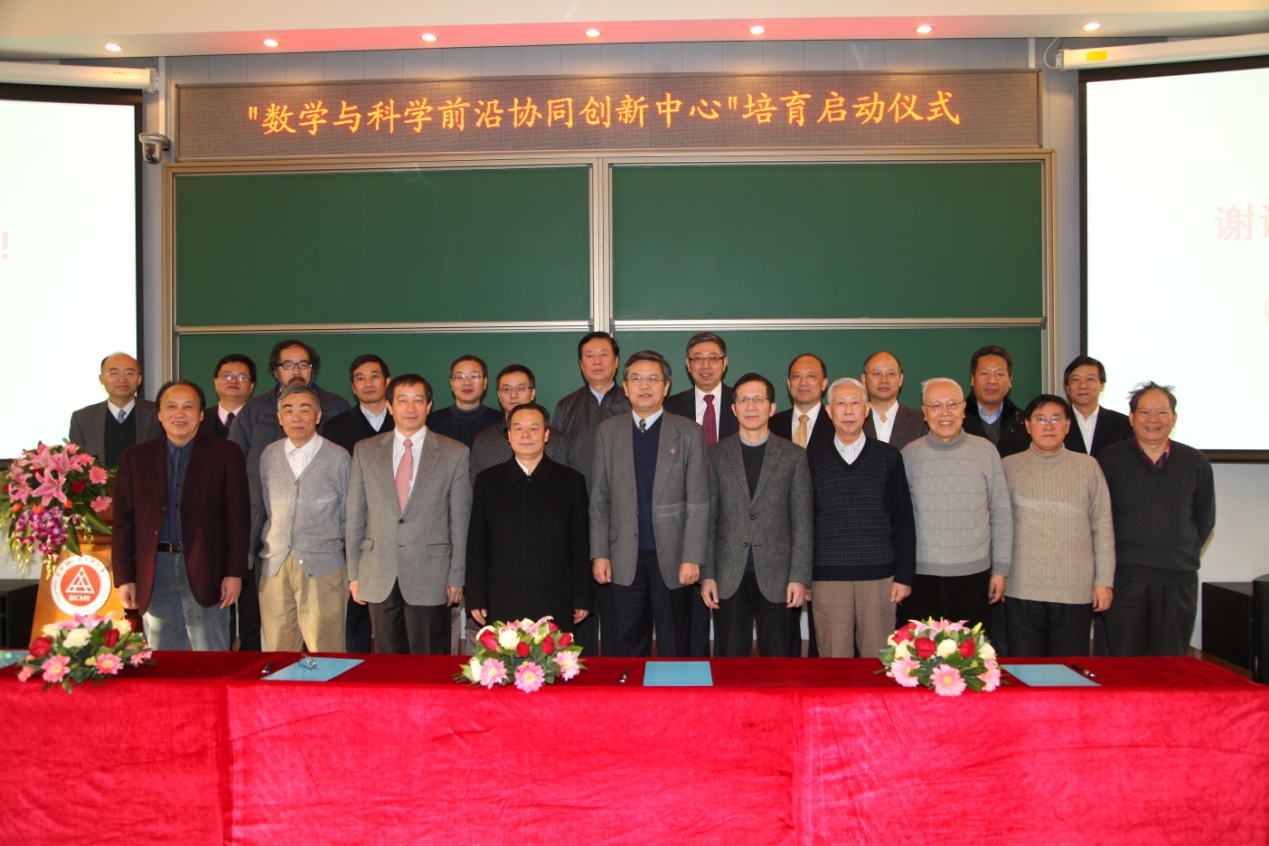 由北京大学、复旦大学、南开大学和四川大学作为牵头单位,联合国内十二所具有数学优势的高等院校和科研机构,经过近一年的筹备工作,“数学与科学前沿协同创新中心”培育启动仪式于2013年1月18日在北京国际数学研究中心举行。协同创新中心四所牵头高校北京大学校长周其凤、复旦大学常务副校长陈晓漫、南开大学校长龚克、四川大学常务副校长李光宪出席启动仪式并致辞,启动仪式由北京大学常务副校长吴志攀教授主持。北京师范大学、华东师范大学、吉林大学、南京大学、中国科技大学、浙江大学、山东大学、武汉大学、西安交通大学、北京应用物理与计算数学研究所、上海交通大学、厦门大学等其他参与高校、研究机构负责人及专家出席本次活动。