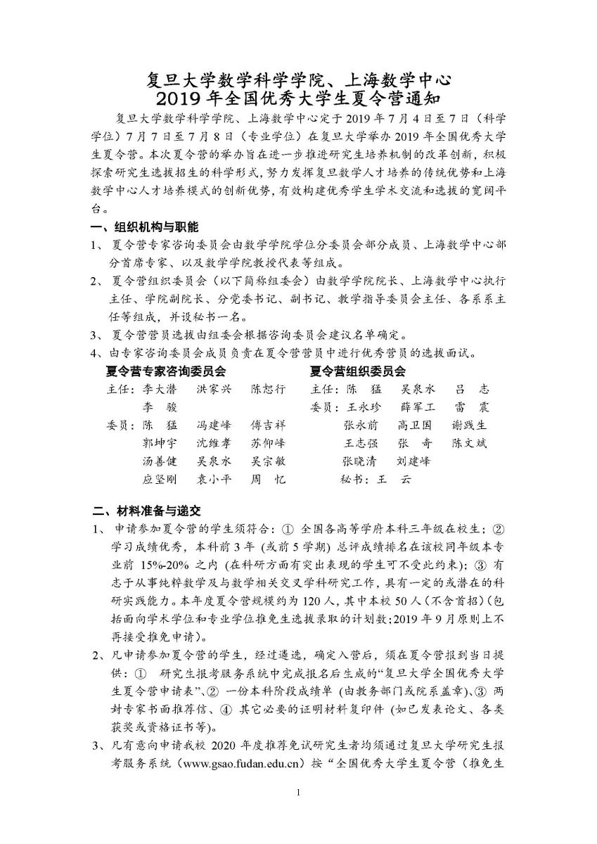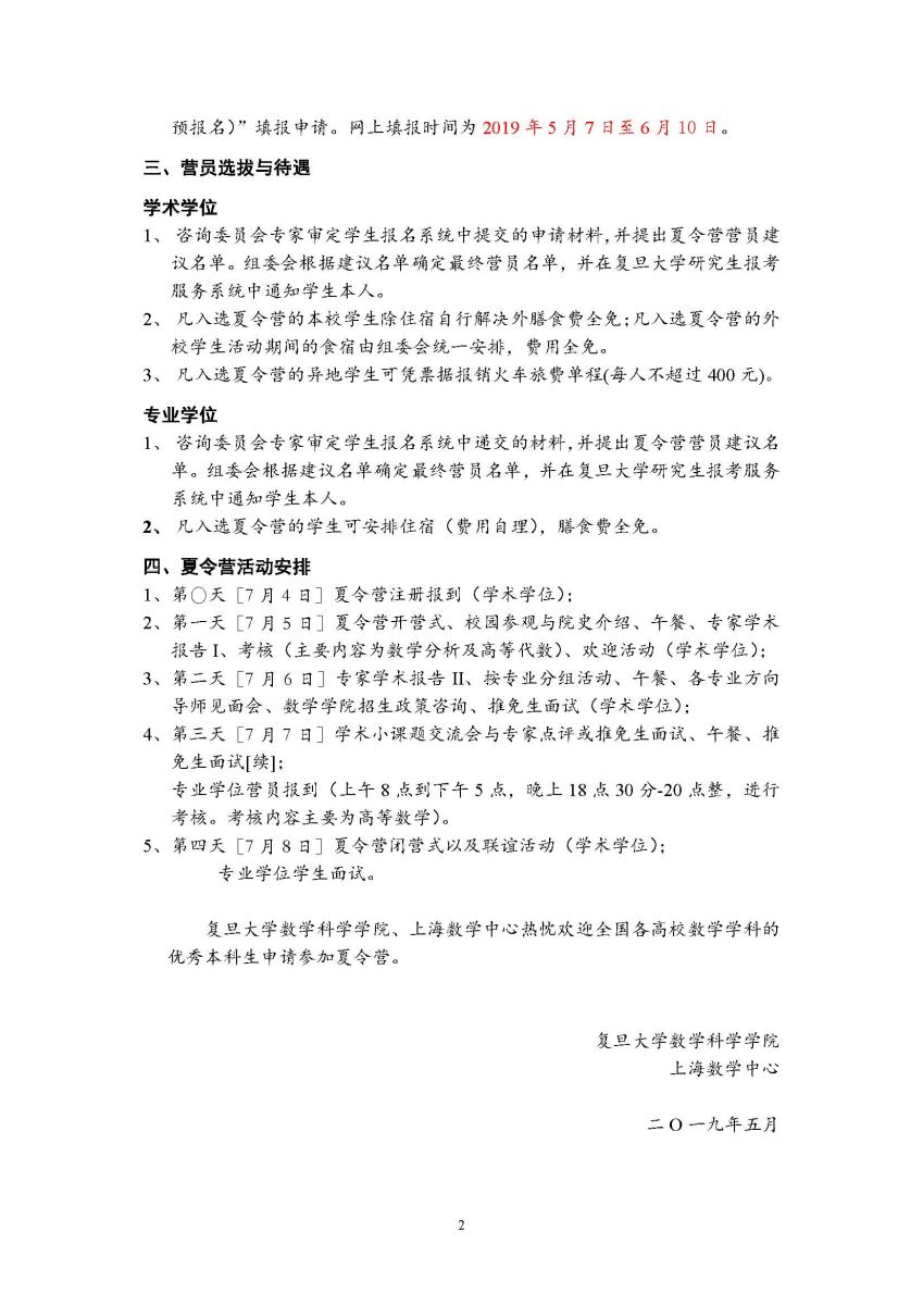 2019年复旦大学数学学科优秀大学生夏令营通知
