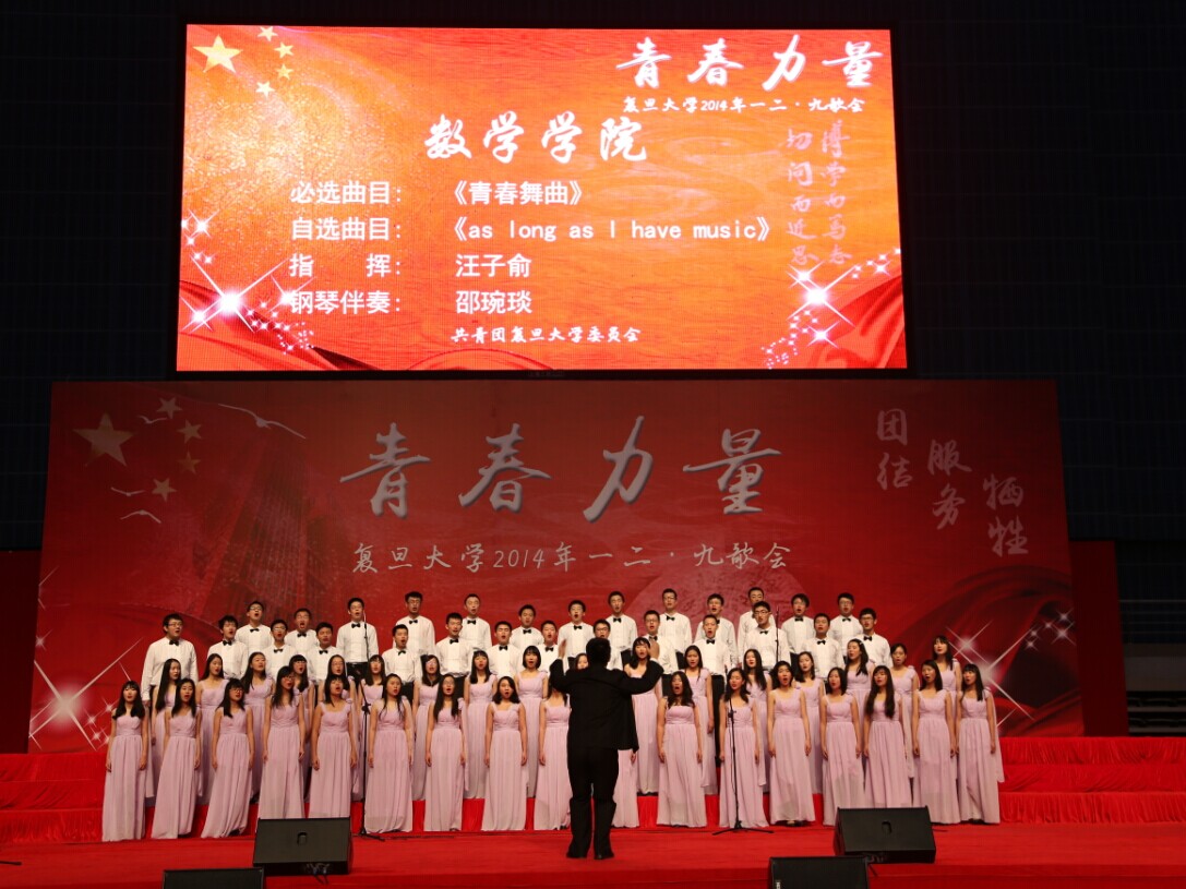 为配合学校开展2014年“青春力量”一二•九主题教育系列活动,弘扬爱国精神、展现学子风采,数学科学学院于10月初正式启动“12·9”主题歌会和主题微电影大赛、摄影大赛的筹备工作。本次“青春力量”一二•九主题歌会数学科学学院的必选曲目是《青春舞曲》,自选曲目是《as long as I have music》。从大一大二中选拔优秀学生组成合唱代表,并鼓励学生积极参与微电影拍摄和摄影大赛中。经过两个多月的辛苦排练,我院学子不仅在艺术修养上有所提升,更接受了爱国主义教育的深刻洗礼,加强了凝聚力。在12月9日的歌会决赛上,以高超的艺术技艺和饱满的热情征服了全场的评委和观众,在时隔12年后再次闯入决赛并荣获铜奖。