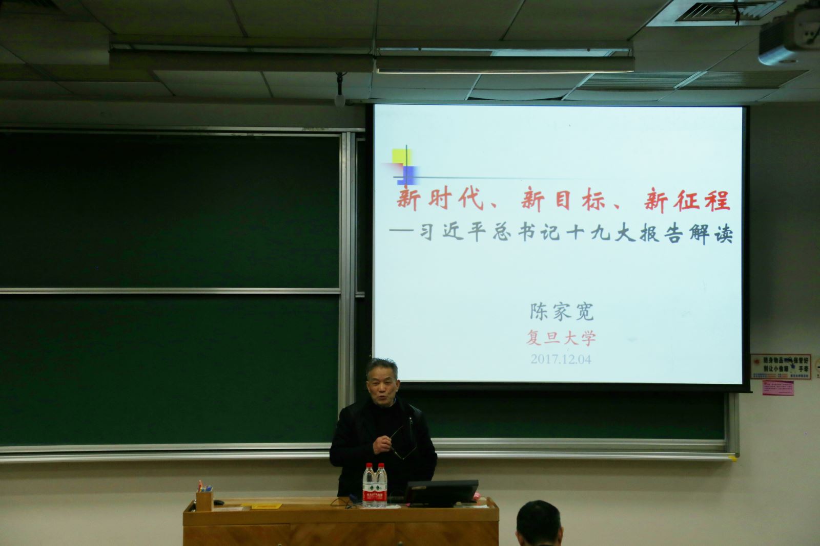 陈家宽教授以“新时代、新目标、新征程”为题与参会师生分享了他对十九大精神的解读。陈家宽是生态学领域专家,他自身的经历就是中华民族从站起来、富起来到强起来的见证。他指出,习近平总书记所作十九大星空(中国)、中国共产党章程(修正案)、十八届中央纪律检查委员会工作星空(中国)及其决议是一个有机的整体,相互联系又有明确分工,必须要全面解读才能深刻理解十九大精神。随后,他对十九大星空(中国)的框架和结构进行了分析,结合丰富的数据、案例梳理了十九大星空(中国)的四大重要理论贡献:“新时代”的重大判断及其定位、“主要矛盾”的重大判断、中国共产党的使命与“新时代”的战略安排、新时代中国特色社会主义思想等。同时,他还向大家介绍了复旦学者对中国特色社会主义理论体系做出的努力,勉励大家在新时代做出复旦人的新贡献。