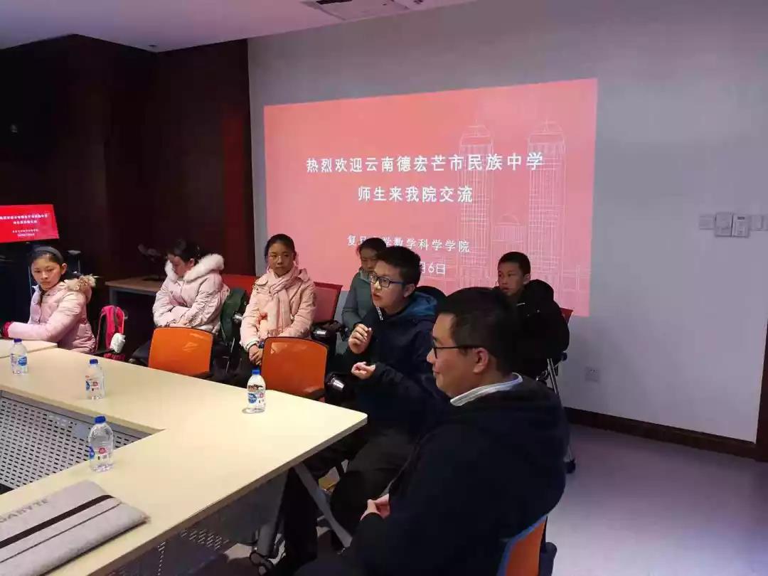 芒市民族中学副校长刘永权简要介绍了该校情况,芒市民族中学始建于1986年,是全州面积最大、人数最多的初级中学之一,近年来在上级党委、政府及教育主管部门的正确领导下,在社会各界的关心支持下,积极推进教育教学改革,全面实施素质教育,连续多年中考成绩在全市名列前茅。刘校长对数学科学学院支教团的师生给予了极高的评价,同学们严谨的治学态度给当地师生留下了深刻的印象,为孩子们树立了良好的榜样。此行来到复旦大学,希望与数学科学学院继续建立良好的合作关系,共同为当地基础教育质量的提升做出贡献。