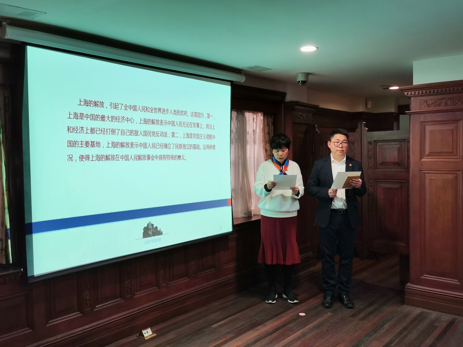 情景互动环节中,讲解员引导大家参观陈列馆。中共上海地下组织斗争史陈列馆复原了文委筹建左联的地点公啡咖啡馆,通过油画、雕塑、实物陈列,场景展示,情景模拟,影视合成等一系列表现手法,展示了刘晓、刘长胜、张承宗等同志领导下的中共上海地下组织发展、斗争的历程。很多展品生动再现了中共上海党组织前赴后继、不屈不挠的精神。参观过程中,大家还化身地下党员,获取并完成秘密任务,“地下党员”陈恕行同志将小心保管的密函交至组织领导。党委副书记刘建峰、联合教工支部书记朱慧敏共同朗读密函——《祝上海解放》社论。随后,党员同志通过在线答题,通关获得情景党课的电子结业证书。