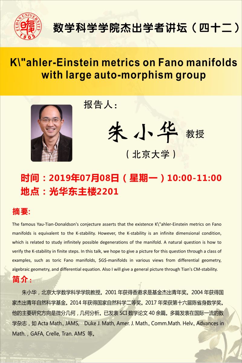 简介:朱小华,北京大学数学科学学院教授。2001年获得香港求是基金杰出青年奖。2004年获得国家杰出青年自然科学基金。2014年获得国家自然科学二等奖。2017年荣获第十六届陈省身数学奖。他的主要研究方向是微分几何,几何分析。已发表SCI数学论文40余篇。多篇发表在国际一流的数学杂志,如Acta Math., JAMS, Duke J. Math, Amer. J. Math., Comm.Math. Helv., Advances in Math.,GAFA, Crelle, Tran. AMS 等。