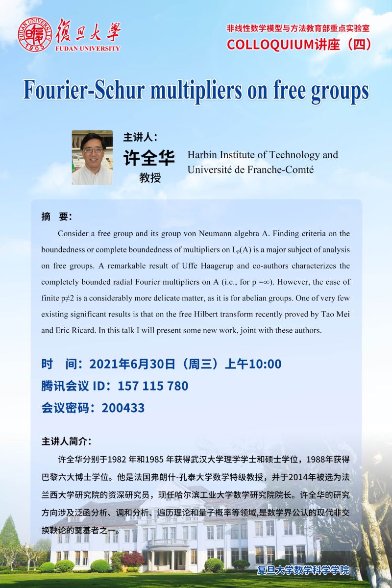 | Presentation Name: | 非线性数学模型与方法教育部重点实验室Colloquium星空(中国)(四):Fourier-Schur multipliers on free groups |