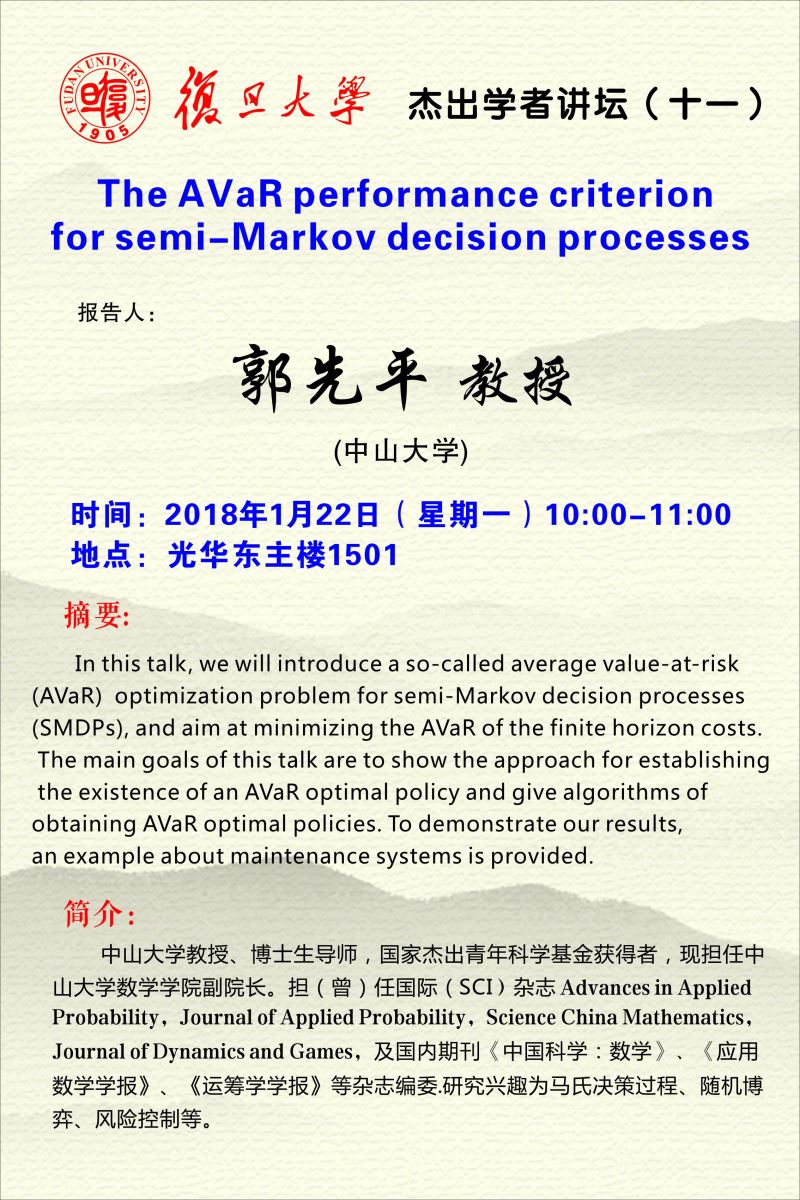 | Presentation Name: | 杰出学者讲坛(十一):The AVaR performance criterion for semi-Markov decision processes |