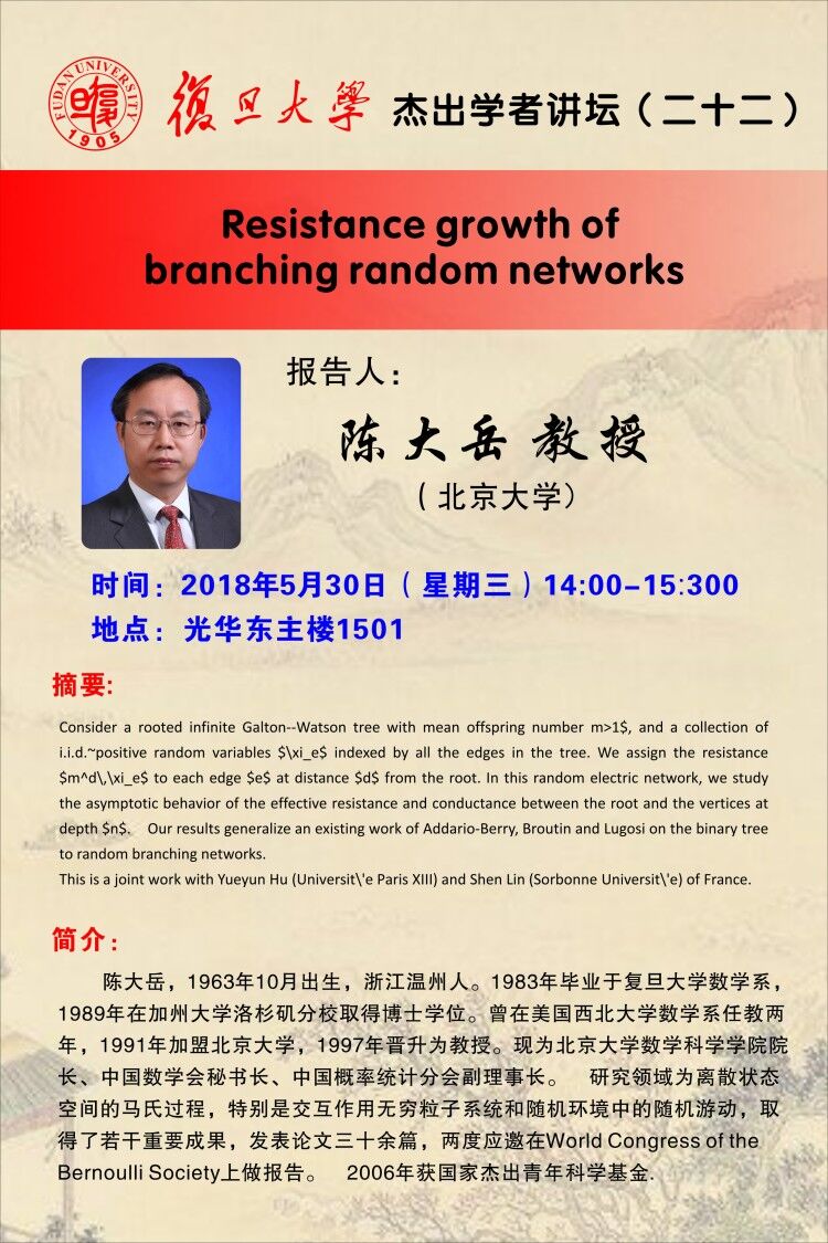 | Abstract: | 摘要:Consider a rooted infinite Galton--Watson tree with mean offspring number m>1$, and a collection of i.i.d.~positive random variables $/xi_e$ indexed by all the edges in the tree. We assign the resistance $m^d/,/xi_e$ to each edge $e$ at distance $d$ from the root. In this random electric network, we study the asymptotic behavior of the effective resistance and conductance between the root and the vertices at depth $n$. Our results generalize an existing work of Addario-Berry, Broutin and Lugosi on the binary tree to random branching networks. This is a joint work with Yueyun Hu (Universit/'e Paris XIII) and Shen Lin (Sorbonne Universit/'e) of France. 简介:陈大岳,1963年10月出生,浙江温州人。1983年毕业于复旦大学数学系,1989年在加州大学洛杉矶分校取得博士学位。曾在美国西北大学数学系任教两年,1991年加盟北京大学,1997年晋升为教授。现为北京大学数学科学学院院长、中国数学会秘书长、中国概率统计分会副理事长。研究领域为离散状态空间的马氏过程,特别是交互作用无穷粒子系统和随机环境中的随机游动,取得了若干重要成果,发表论文三十余篇,两度应邀在World Congress of the Bernoulli Society上做星空(中国)。2006年获国家杰出青年科学基金。