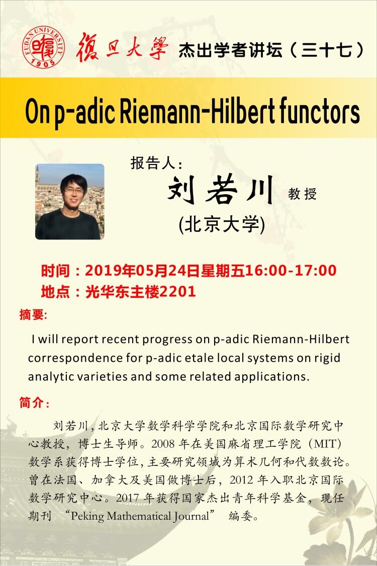 | Presentation Name: | 杰出学者讲坛(三十七):On p-adic Riemann-Hilbert functors |