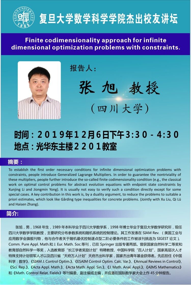 | Presentation Name: | 杰出校友讲坛第八期:Finite codimensionality approach for infinite dimensional optimization problems with constraints. |