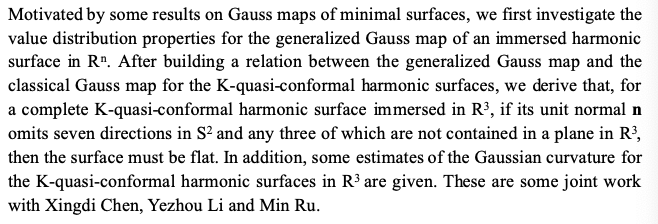 | Presentation Name: | Value distribution properties for the Gauss maps of the immersed harmonic surfaces |